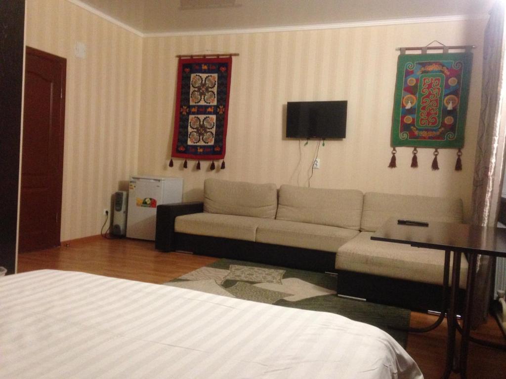 "You get a lot for the price. For a couple it was the best budget accomodation in the city of Almaty. We received a very large bedroom with a double bed, a couch, an extra bed, a table, and a private bathroom. The personnel are polite and helpful and the hotel has a lovely little inner garden giving you a very open motel-like feeling. The mall called Forum is a short 5 to 10 minute walk from the room and you can easily navigate around to other parts of downtown Almaty from here without needing a cab. So in short you get a big bedroom, a private bathroom, and a good location near the city centre for an exceptionally affordable price."